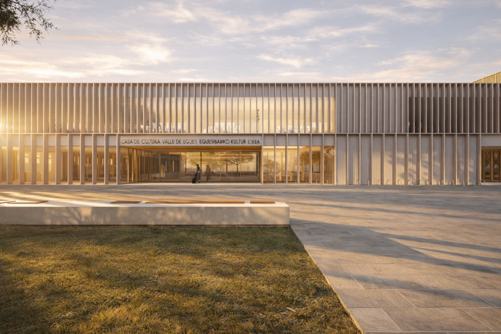 La propuesta se concibe como una pieza de transición entre la ciudad y el paisaje, integrando la nueva Casa de Cultura en el encuentro entre la plaza consistorial y el parque fluvial. Más que un edificio autónomo, se plantea como una extensión del entorno natural, capaz de conectar ambos ámbitos mediante una estrategia de continuidad espacial, visual y ecológica.