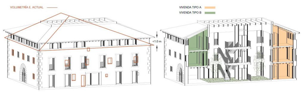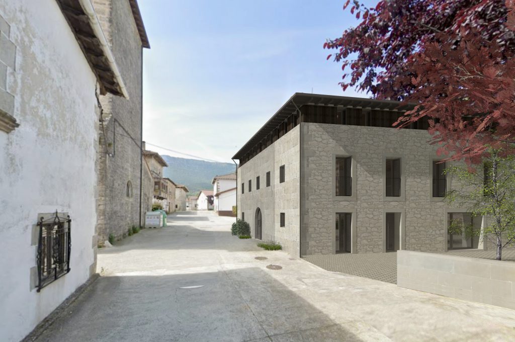 La Casa Eskribarena, situada en el valle de Arakil, es un caserío tradicional del norte de Navarra que refleja la arquitectura rural de la zona: muros de piedra, estructura de madera y espacios destinados tanto a la vida familiar como a la actividad agrícola y ganadera. Como muchos de estos caseríos, ha quedado en desuso con el paso del tiempo. El proyecto, presentado al concurso bajo el lema Zortzi Zutabe (ocho pilares), resultó finalista, proponiendo una rehabilitación integral que transforma la vivienda unifamiliar en un edificio colectivo adaptado a las necesidades contemporáneas.