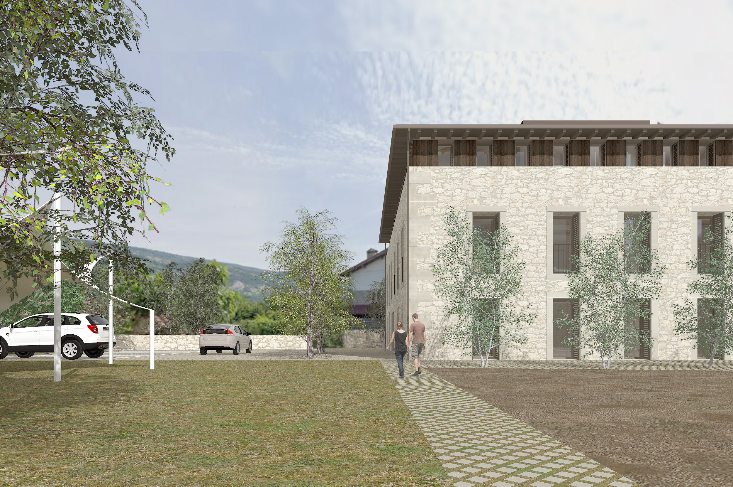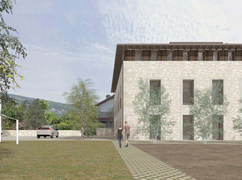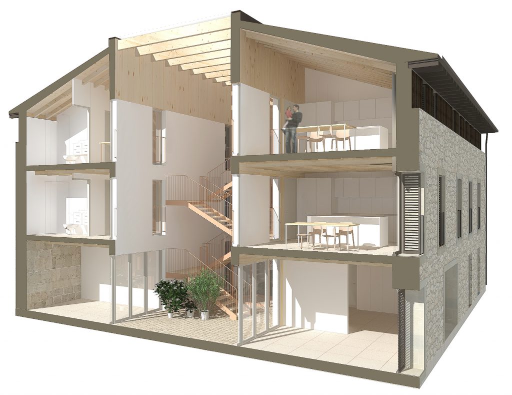 La propuesta plantea la creación de cinco viviendas: dos en cada planta superior y una en la planta baja, que además incorpora espacios comunes como lavandería, txoko, gimnasio o sala de instalaciones. Las viviendas son flexibles y permiten configuraciones de 1 a 4 dormitorios, manteniendo siempre amplias zonas de estar con doble orientación y vistas a la sierra de Aralar. Cada unidad dispone de un espacio polivalente adicional, pensado como zona de trabajo o esparcimiento, lo que refuerza la adaptación a formas de vida actuales.