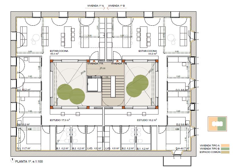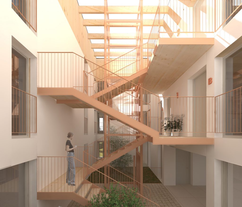 Uno de los elementos clave de la propuesta es el patio central, generado al liberar el espacio comprendido entre los ocho pilares originales. Este patio se concibe como un espacio comunitario que alberga las escaleras y el ascensor, además de convertirse en un regulador climático: en invierno actúa como captador solar y en verano permite la ventilación cruzada. Gracias a él, las viviendas gozan de mayor iluminación, ventilación natural y un espacio protegido que refuerza la vida colectiva.