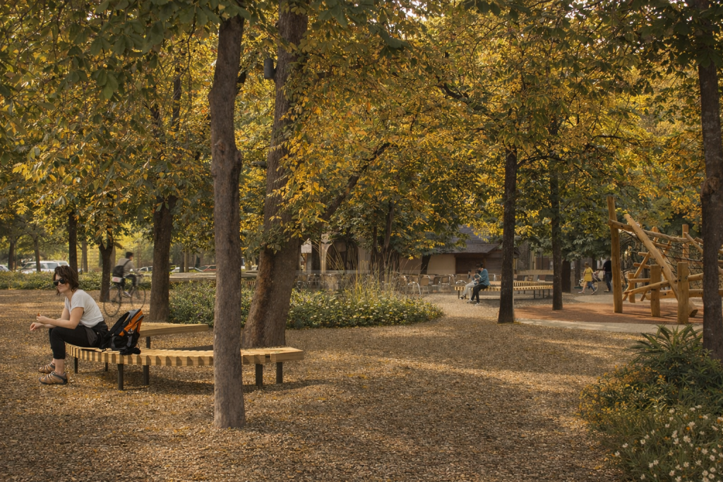Para ello, se introduce una geometría autónoma, el círculo, cercano al lenguaje del edificio de aseos, de la peana del crucero, de las zonas de protección de los árboles. Este gesto geométrico también ayudará a dotar de autonomía de diseño al bosquecillo. Es un dibujo blando, nada rígido, mutable, graduable.