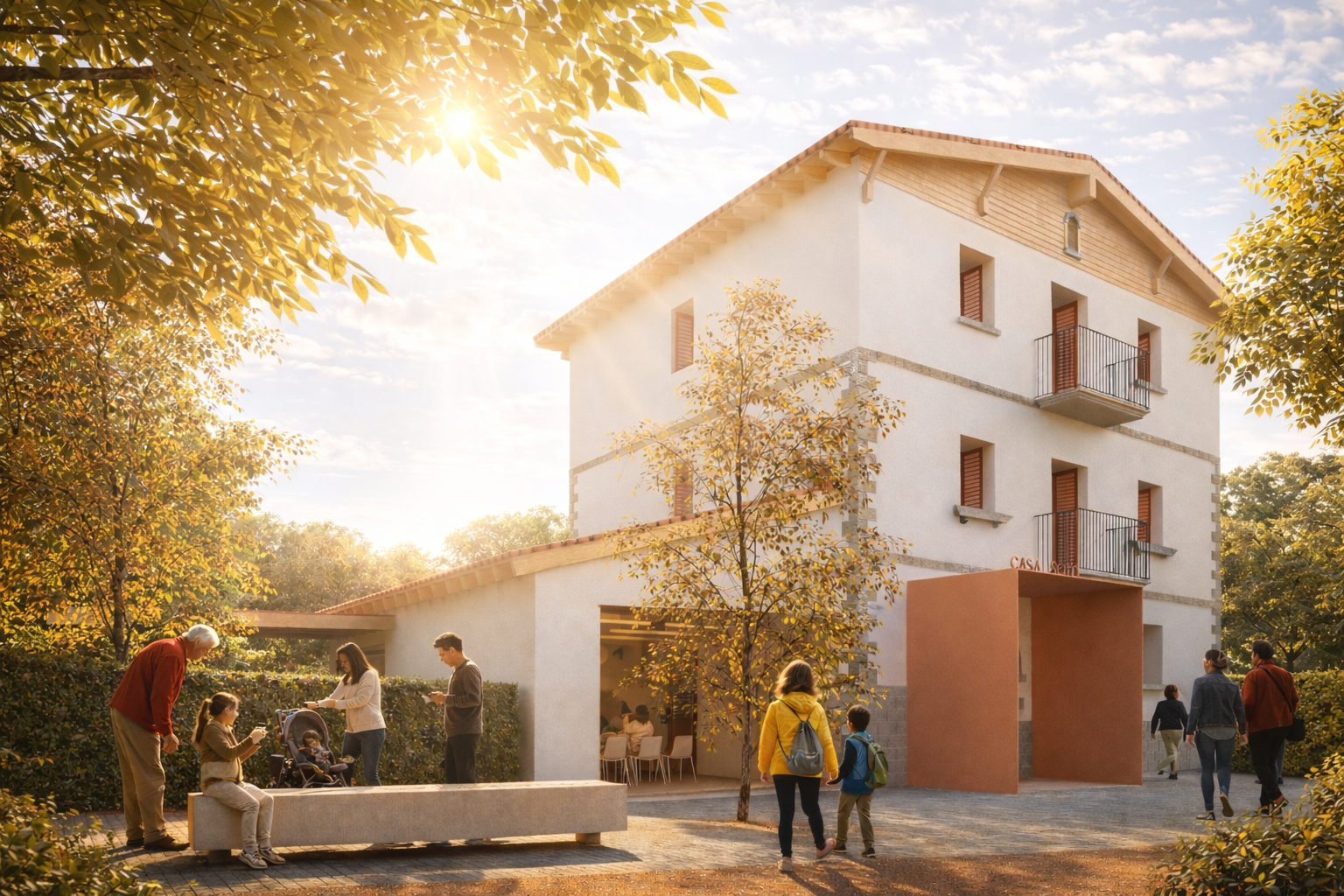La propuesta se concibe como una pieza de transición entre la ciudad y el paisaje, integrando la nueva Casa de Cultura en el encuentro entre la plaza consistorial y el parque fluvial. Más que un edificio autónomo, se plantea como una extensión del entorno natural, capaz de conectar ambos ámbitos mediante una estrategia de
