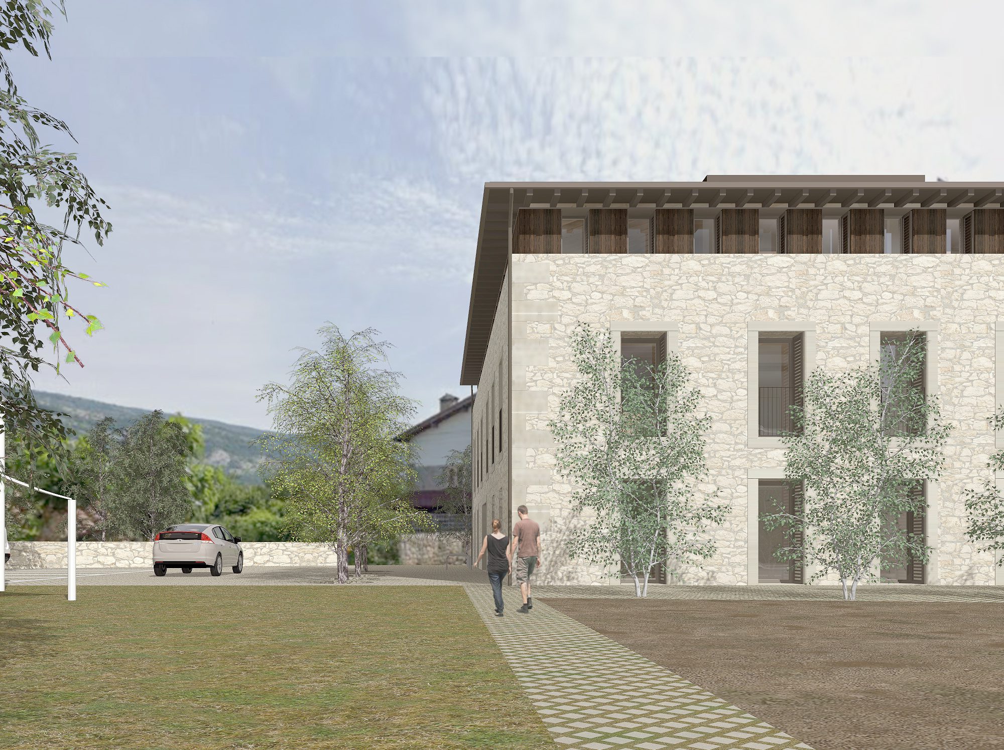 La Casa Eskribarena, finalista en concurso bajo el lema Zortzi Zutabe (ocho pilares), propone transformar un caserío tradicional del norte de Navarra en un edificio de viviendas colectivas contemporáneas. El proyecto respeta la esencia arquitectónica —muros de piedra, madera, cubierta a cuatro aguas— y la reinterpreta con un patio central abierto a la luz y